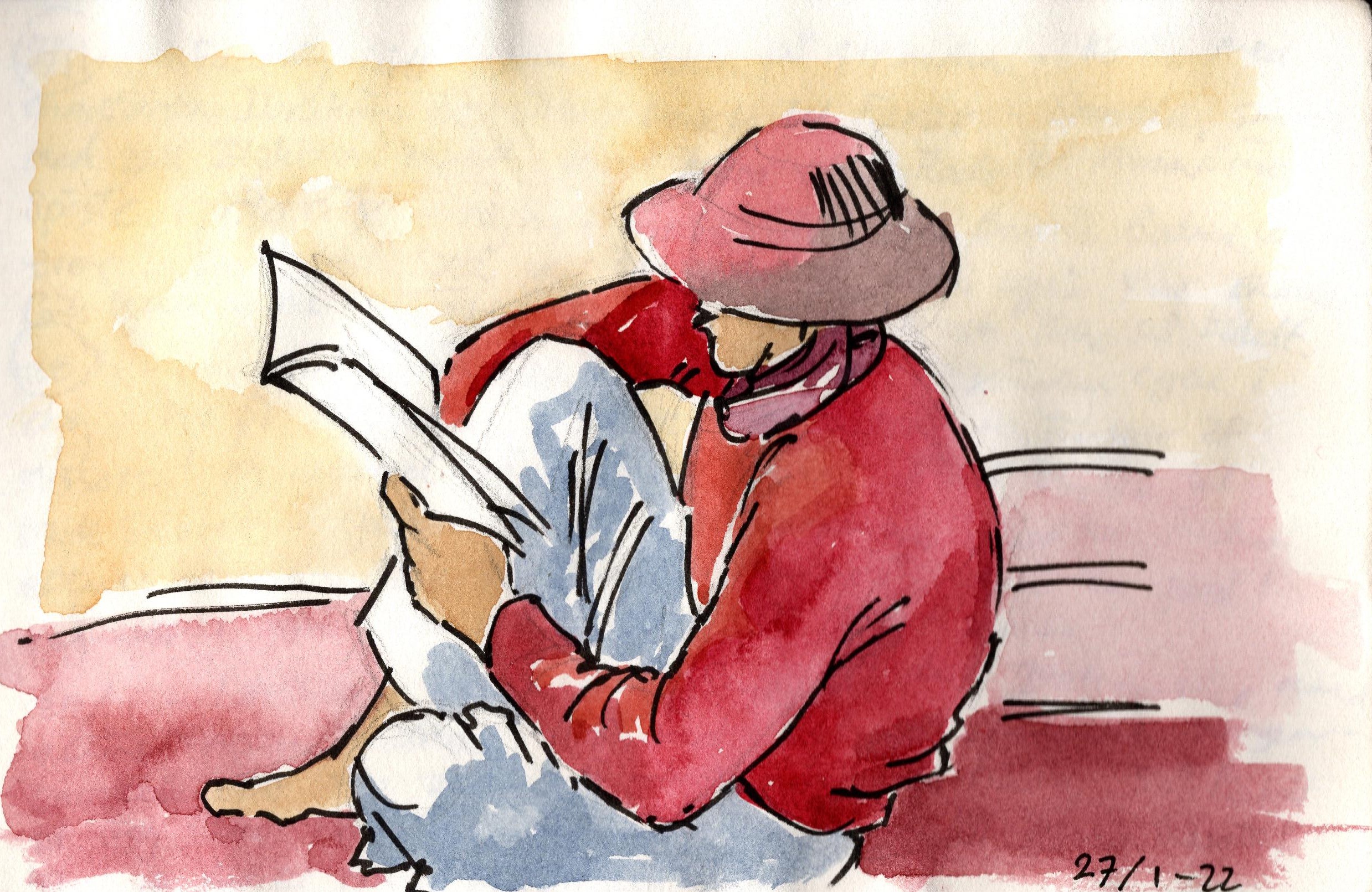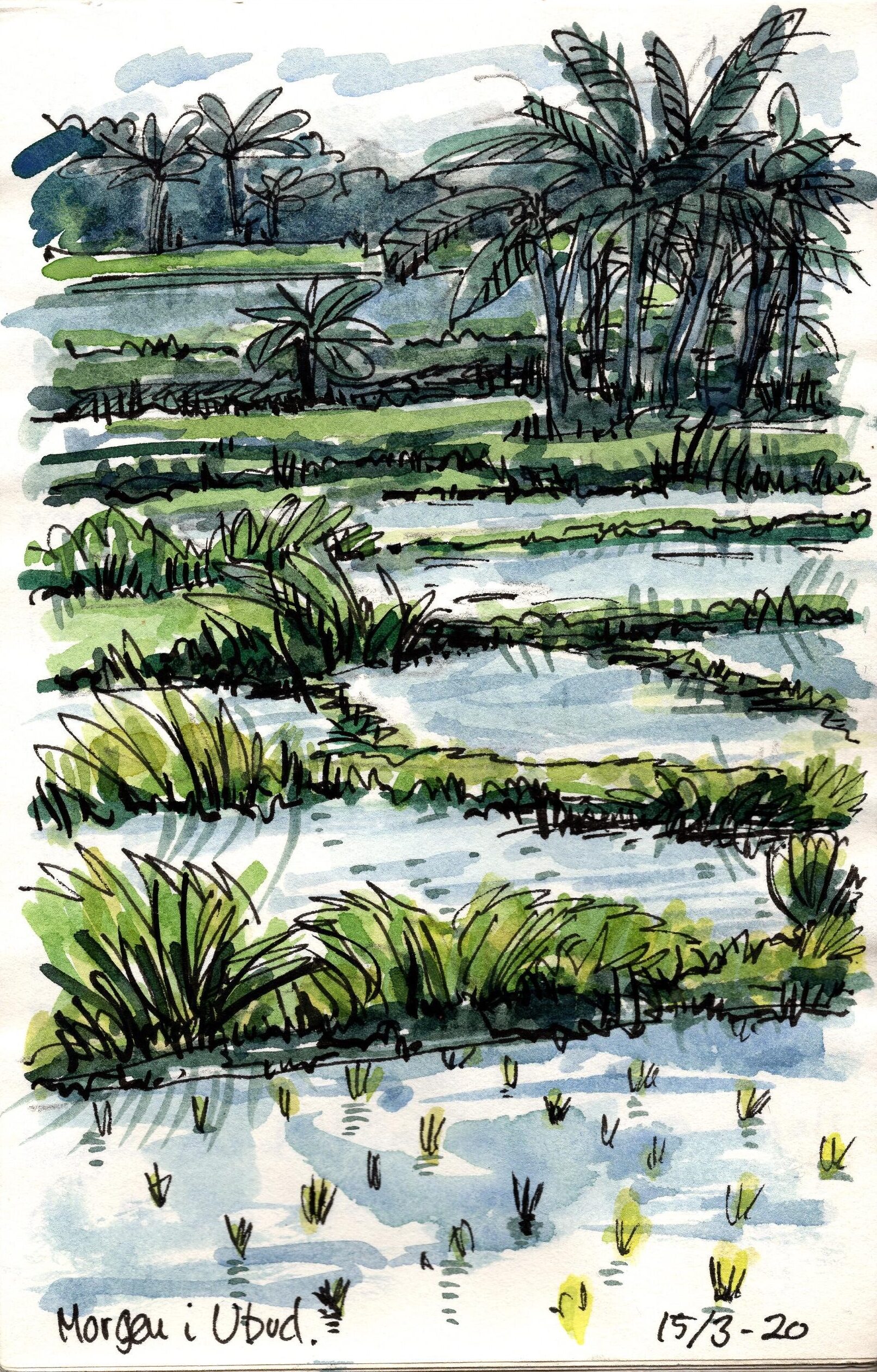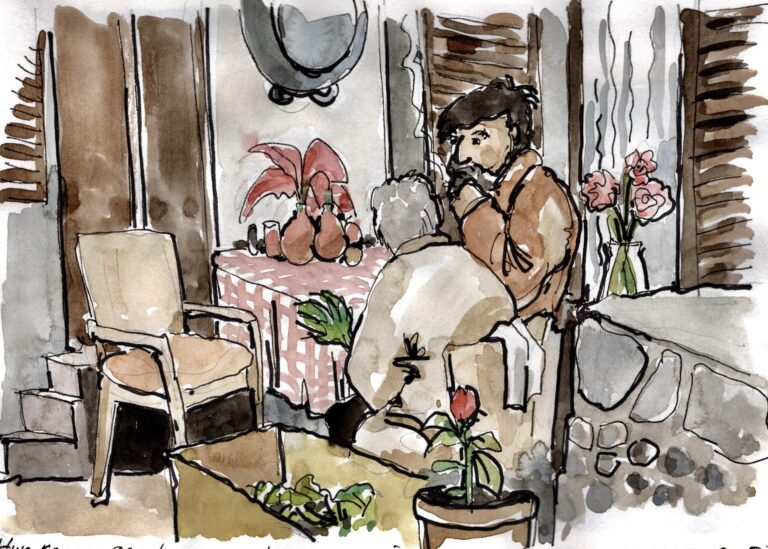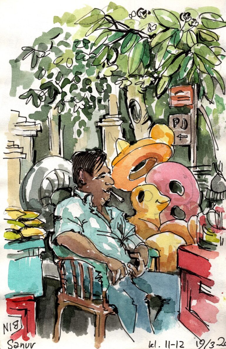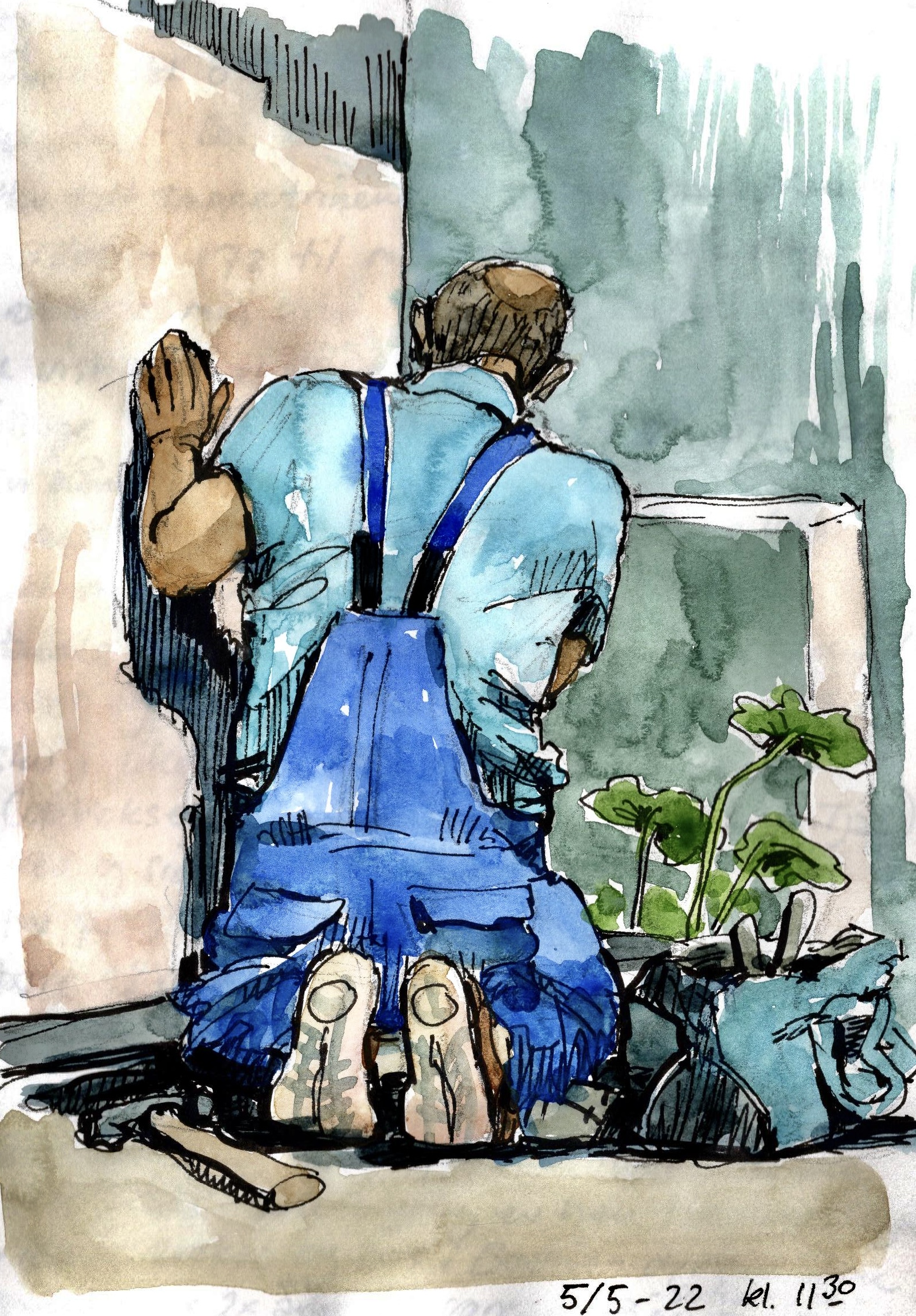 Jeg slæber altid mit tegnegrej med i rygsækken, nogle dage er jeg kommet hjem om aftenen uden den mindste streg på papiret. Men at kunne sætte mig når og hvor jeg vil og fordybe mig i at tegne en smuk udsigt eller en sjov situation skaber mulighed for fordybelse og giver nærvær som er meget tilfredstillende. Samtidig er billedsproget nonverbalt og jeg har haft mange skønne stunder med mennesker hvor vi har kunnet kommunikere på tværs af sprogbarriere, alder og kultur.